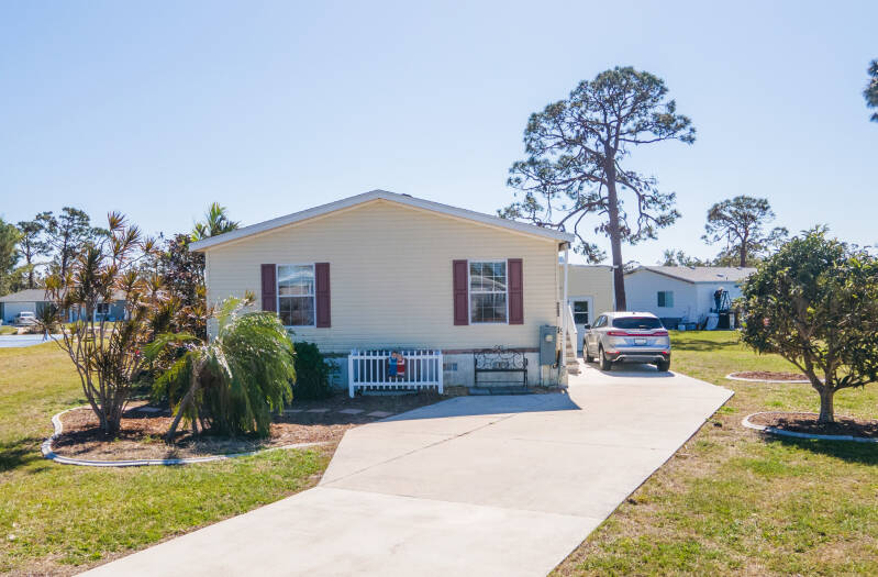 Why shovel snow when you can enjoy the warm Florida weather year-round? This manufactured home in the community of Pines at Sandalhaven is the perfect vacation getaway or permanent Florida residence! Pride of ownership is apparent the moment you arrive with the well-cared for landscaping and artful touches throughout the home. Which will you notice first when you step inside, the engineered hardwood floors or the soaring cathedral ceilings?