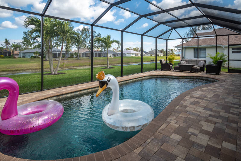 Don’t forget to take a dip in your HEATED SALTWATER POOL, especially after a long day at the beach collecting shells and sharks teeth! Need to rinse off before your next adventure? Head directly to the guest bathroom from the lanai to use the shower. Bring your cornhole boards or lounge in your backyard as you look at out at the canal and watch the Florida wildlife in this quiet neighborhood.