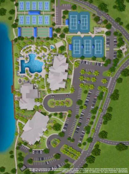 Amenities of the community include: a saltwater pool and heated spa, clubhouse and fitness center, bocce ball courts, tennis courts, pickleball courts, dog park, community garden, security gates, restaurant, fire pits, lakeside boardwalk and more! This community is still under construction and will feature brand new homes.